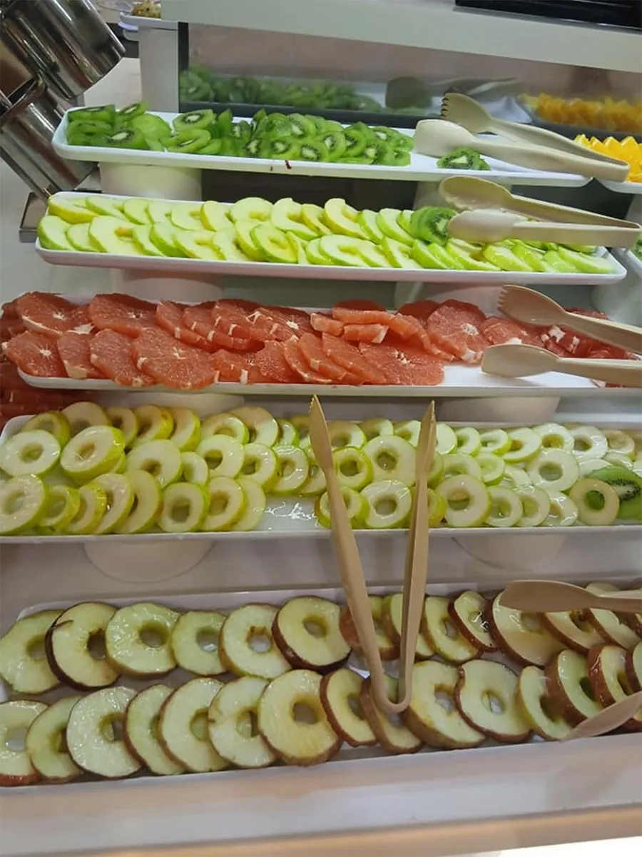 Cu atât mai mult, este important de precizat faptul că fotografiile arată o selecție variată de fructe tăiate și aranjate – kiwi, mere, grapefruit, ananas – toate feliate uniform și pregătite pentru servire. Acestea sunt dispuse pe rânduri, pe platouri, fiecare sortiment având ustensile separate pentru servire.