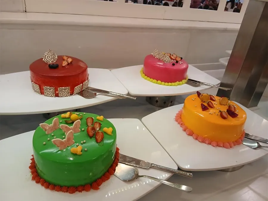Pe o masă, deserturile atrag atenția prin culorile puternice și decorurile elegante. În imaginea publicată de turistul român se văd patru torturi glazurate – unul roșu, unul roz, unul verde și unul portocaliu – fiecare împodobit cu detalii decorative atent lucrate.