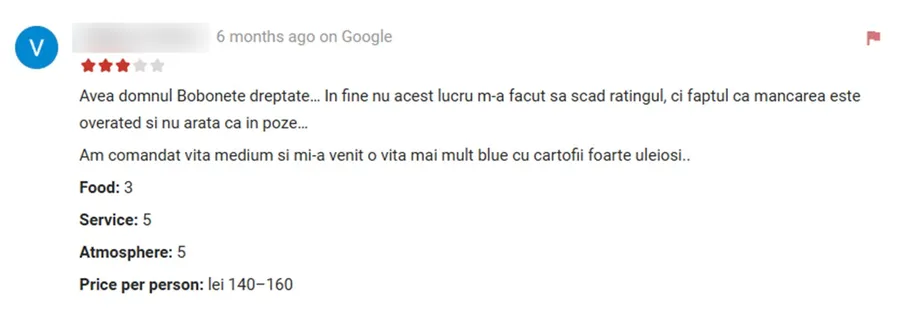 Am comandat vită medium și mi-a venit o vită mai mult blue cu cartofi foarte uleioși. Food: 3, Service: 5, Atmosphere: 5, Price per person: lei 140–160”, se arată în recenzia lăsat de client.