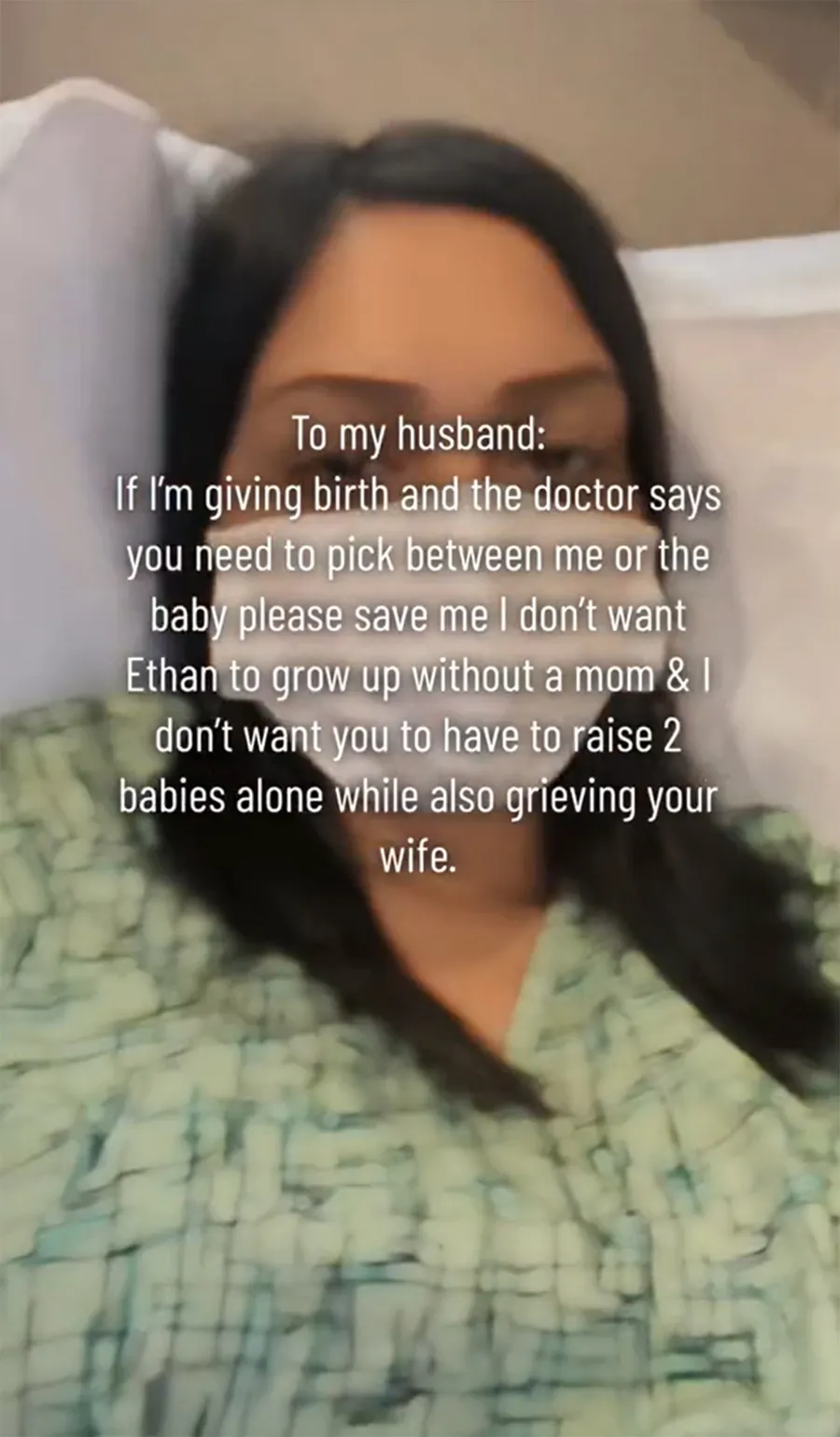 „Dacă sunt în travaliu și doctorul spune că trebuie să alegi între mine și copil, te rog, salvează-mă pe mine! Nu vreau ca Ethan să crească fără mamă și nici nu vreau ca tu să te ocupi de doi copii, singur, în timp ce plângi și după pierderea soției tale”, a declarat ea în videoclipul publicat.