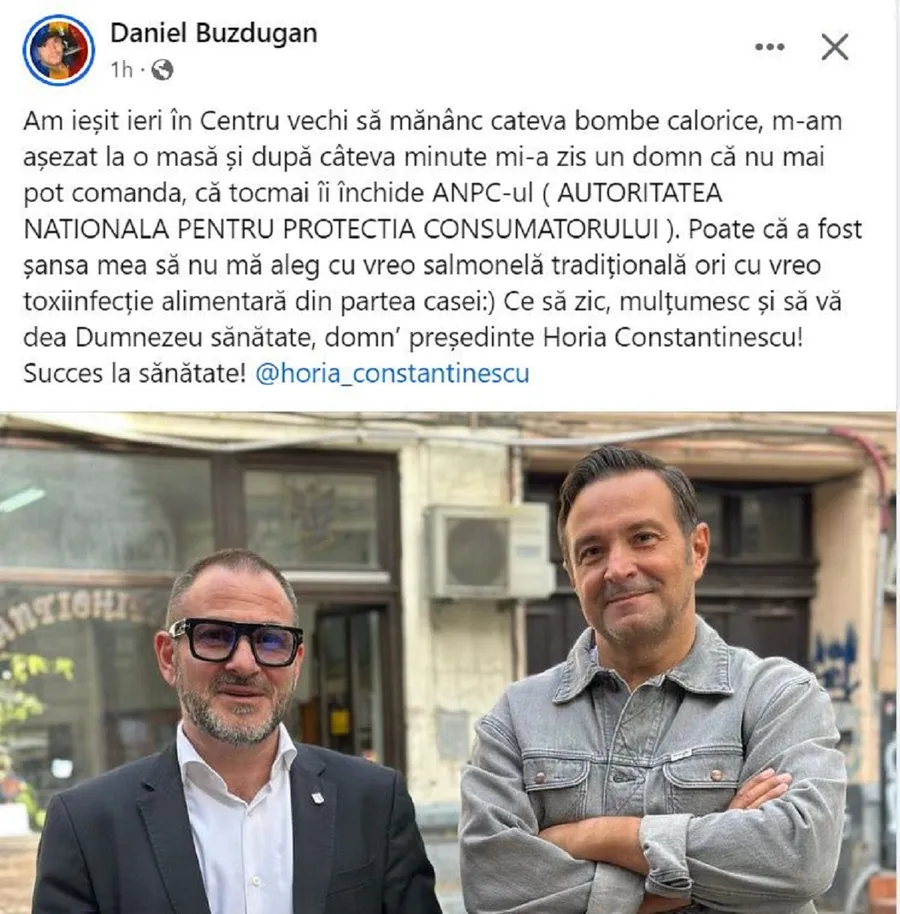 ”Am ieșit ieri în Centrul vechi să mănânc câteva bombe calorice, m-am așezat la o masă și după câteva minute mi-a zis un domn că nu mai pot comanda, că tocmai îi închide ANPC-ul (AUTORITATEA NAȚIONALĂ PENTRU PROTECȚIA CONSUMATORULUI). Poate că a fost șansa mea să nu mă aleg cu vreo salmonelă tradițională, ori cu vreo toxiinfecție alimentară din partea casei :). Ce să zic, mulțumesc și să vă dea Dumnezeu sănătate, domn` președinte Horia Constantinescu. Succes la sănătate @horia_constantinescu”, este postare lui Daniel Buzdugan de pe Facebook.