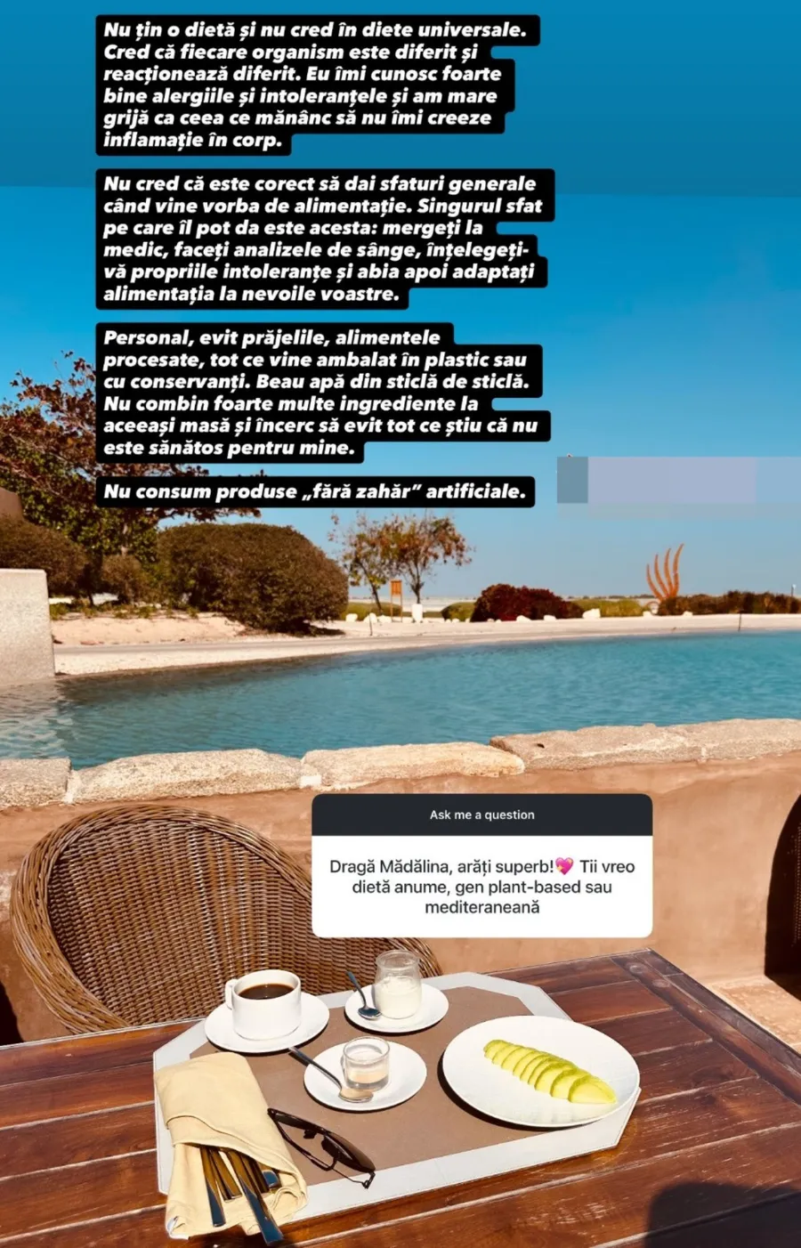 Singurul sfat pe care îl pot da este acesta: mergeți la medic, faceți analizele de sânge, înțelegeți-vă propriile intoleranțe și abia apoi adaptați alimentația la nevoile voastre. Personal, evit prăjelile, alimentele procesate, tot ce vine ambalat în plastic sau cu conservanți. Beau apă din sticlă de sticlă. Nu combin foarte multe ingrediente la aceeași masă și evit tot ce știu că nu este sănătos pentru mine. Nu consum produse «fără zahăr» artificiale”, a scris Mădălina Ghenea pe Instagram.