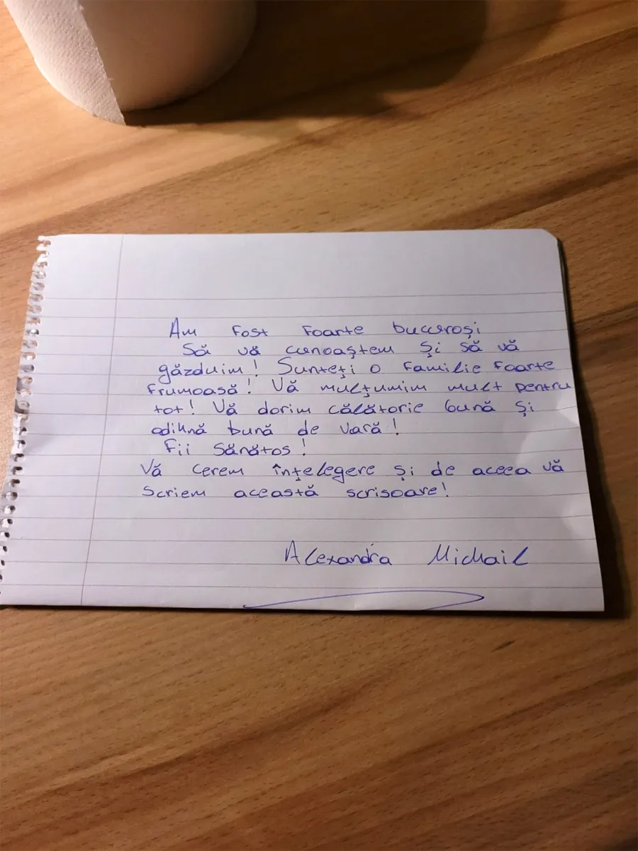 Ce bilețel a primit o româncă, în noaptea plecării din Grecia. A fost scris în română de proprietarul cazării și lăsat pe parbrizul mașinii