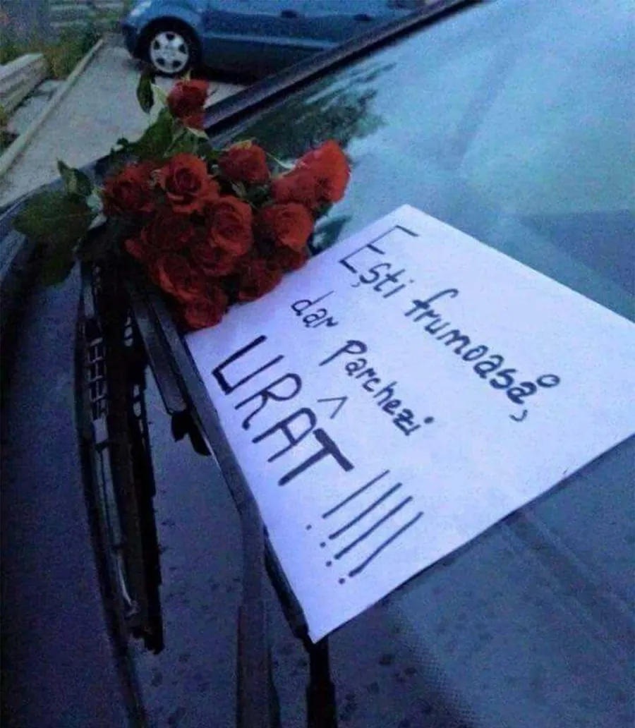 Mai exact, celălalt participant la trafic i-a lăsat în parbriz un bilețel cu mesajul „Ești frumoasă, dar parchezi urât”. Cu toate acestea, bărbatul nu s-a oprit aici. În încercarea de a nu-i răni sentimentele șoferiței, individul i-a lăsat pe capotă și un buchet de trandafiri roșii.