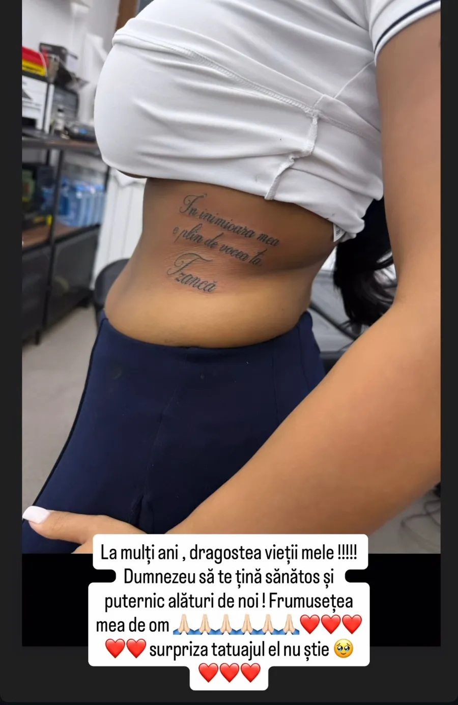 „La mulți ani, dragostea vieții mele!!!! Dumnezeu să te țină sănătos si puternic alături de noi! Frumusețea mea de om. Surpriza tatuajului, el nu știe”, a fost mesajul din mediul online.