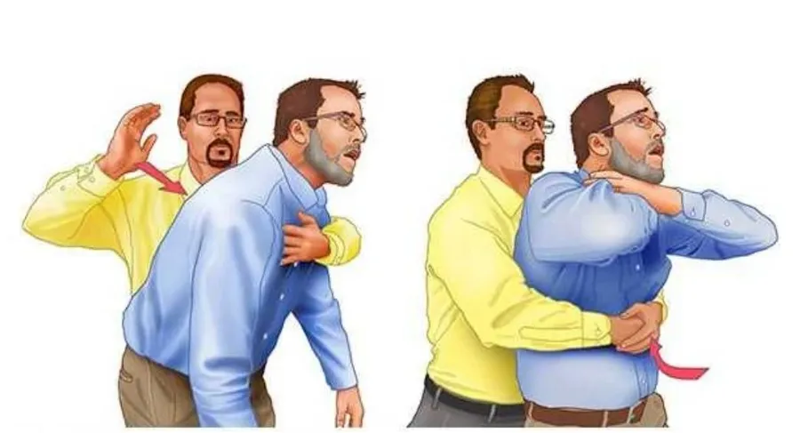 Tot ceea ce trebuie să faci este să stai în spatele persoanei care s-a înecat și să o cuprinzi cu brațele la nivelul abdomenului. Vei ține brațele strânse în jurul abdomenului persoanei care are nevoie de ajutor, cu pumnii strânși unul peste celălalt. Mai apoi se vor aplica o serie de cinci compresii până când căile respiratorii sunt deblocate – corpul străin sau mâncarea sunt eliminate.