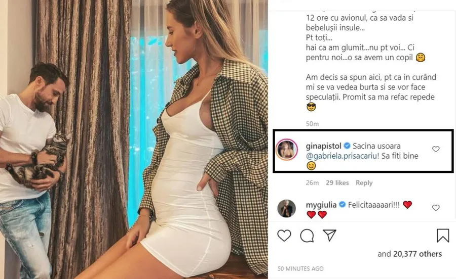 „Sarcină ușoară, Gabriela! Să fiți bine!”, e mesajul postat de Gina Pistol.