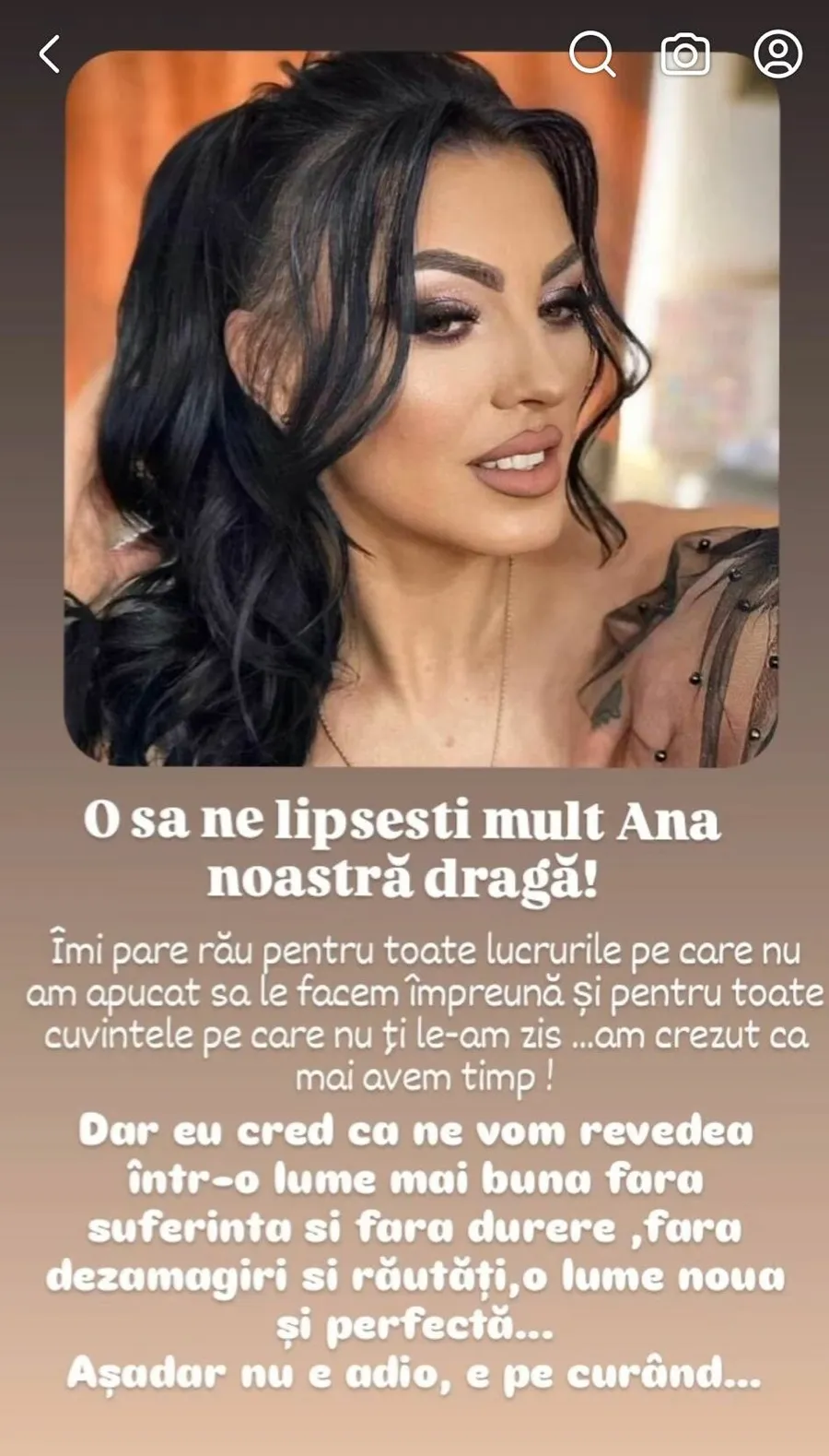 „O sa ne lipsești mult Ana noastră dragă! Îmi pare rău pentru toate lucrurile pe care nu am apucat să le facem împreună și pentru toate cuvintele pe care nu ți le-am zis …am crezut că mai avem timp! Dar eu cred că ne vom revedea într-o lume mai bună fără suferință și fără durere, fără dezamăgiri si răutăți, o lume nouă și perfectă…Așadar nu e adio, e pe curând”, a scris o prietenă apropiată.