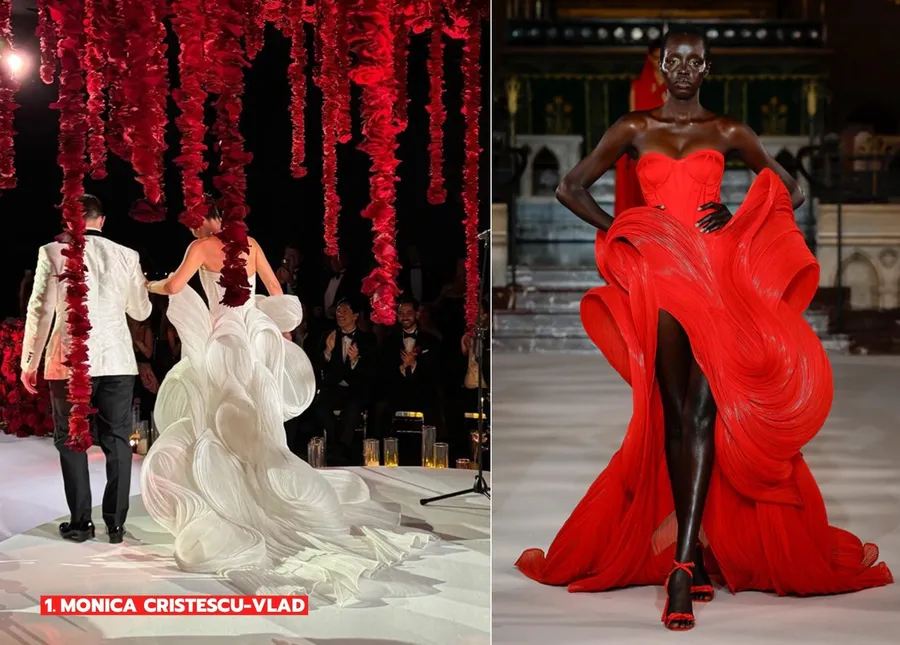 Deschidem lista cu mireasa care a strălucit într-o rochie Gaurav Gupta, Look 19 din colecția Spring-Summer 2024, cu bustul personalizat, ca să fie, desigur, mai exclusivistă. Gaurav Gupta, designerul indian cunoscut pentru faptul că își trage constant inspirația de la Iris Van Herpen, pare să fie într-o misiune neoficială de a crea „Iris Van Herpen la preț redus”. Dacă nu știai, acum știi – Gaurav Gupta e acea variantă budget-friendly a lui Iris Van Herpen, un fel de „inspirat de”, dar fără eticheta de preț astronomică.