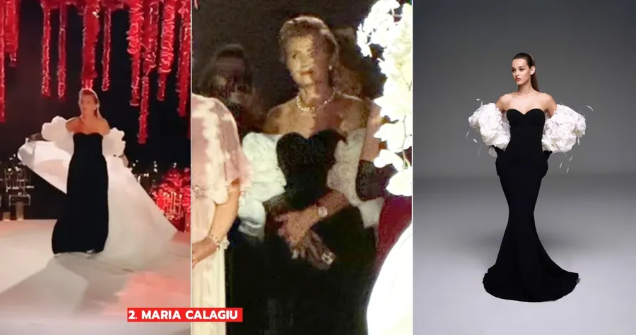 Naşa tinerilor căsătoriţi, Maria Calagiu, a optat pentru o ţinută simplă, o rochie inspirată de Nicole Felicia Couture, pe care a accesorizat-o cu o capă cu trandafiri. Asta ar putea explica de ce o altă invitată, Cristina Ich (despre care vom discuta imediat), și-a abandonat capa identică, probabil fiindcă nu voia să fie confundată. De-a lungul timpului, familia Calagiu a deţinut mai multe francize de modă, iar acum controlează un magazin de design interior pe calea Dorobanţi din Capitală. Când e vorba însă de bani, nu e rău să prinzi un ”chilipir”.