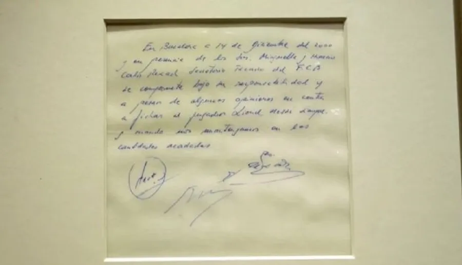 „Am înțeles: „La Barcelona, în data de 14 decembrie 2000 și în prezența domnilor Minguella și Horacio, Carles Rexach, directorul sportiv al FC Barcelona, este de acord, pe răspunderea sa și indiferent de orice opinie divergentă, să semneze cu jucătorul Lionel Messi, cu condiția să respectăm sumele convenite.” , scrie pe șervețelul semnat de Messi.