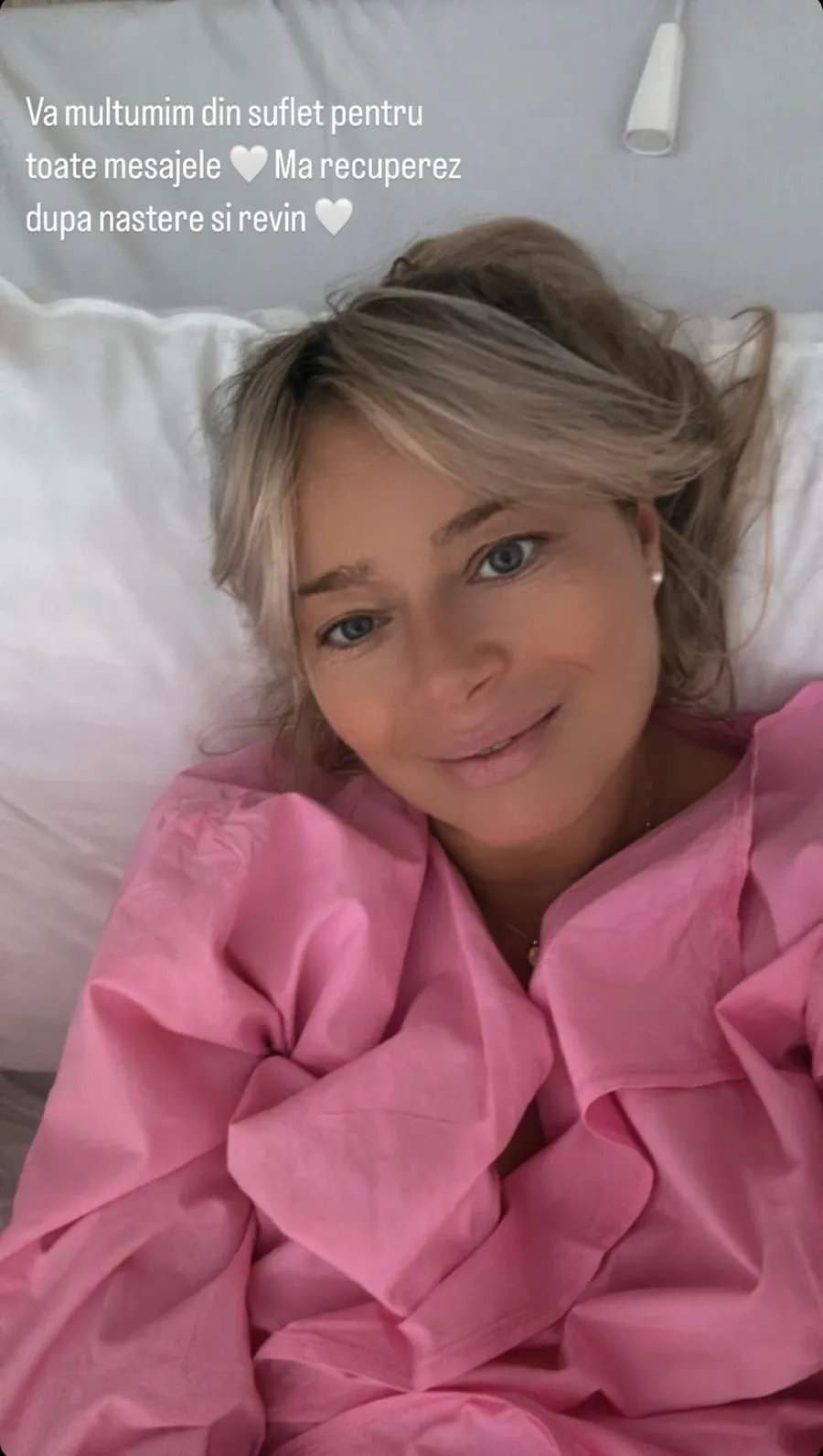 „Vă mulțumim din suflet pentru toate mesajele. Mă recuperez după naștere și revin!”, a fost mesajul postat de Laura Cosoi în dreptul unei fotografii de pe patul de spital.