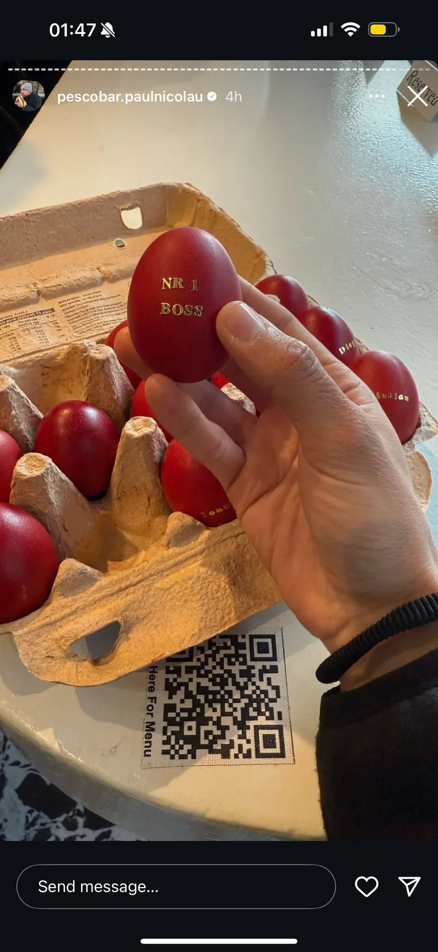 Pregătirile pentru Paște au început încă de la primele ore ale dimineții de sâmbătă, 19 aprilie. În stilul caracteristic, afaceristul a ales un model mai special cu care a încondeiat ouăle de pe masa de Paște. Fiecare ou roșu a fost inscripționat cu diverse mesaje, iar unul dintre ele le-a atras atenția internauților:”Nr. 1 Boss”