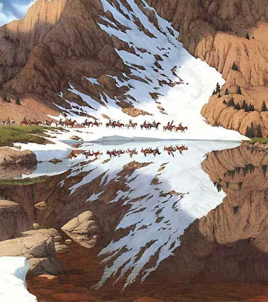 Imaginea folosită în test înfățișează un peisaj care poate fi interpretată în două moduri diferite: unii oameni văd întâi un grup de bărbați călăre traversând munți înzăpeziți, în timp ce alții observă în prim-plan un vultur zburător. Tu ce ai văzut prima oară?