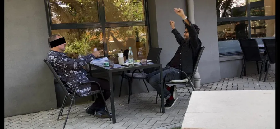 Acesta, pe de altă parte, era îmbrăcat mai elegant, în ciuda faptului că s-au întâlnit la o cafea, și nu la o petrecere. Cezar Ouatu a luat prânzul în localul cu pricina, aflat în zona de Nord a Capitalei, unde a cerut un preparat din pește, iar starea euforică a artistului nu se datorează nicicum băuturilor alcoolice. Pe toată perioada șederii la terasă, artistul a băut apă plată!