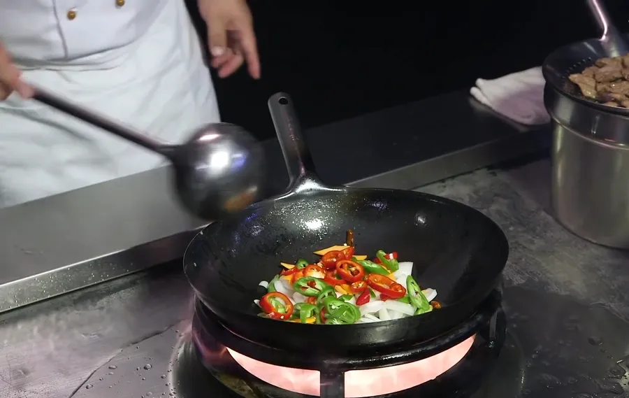 În același wok se călesc usturoiul, ardeii iuți, ceapa și ardeii grași timp de aproximativ un minut, păstrând textura crocantă. Se reintroduce carnea, se adaugă sosul și ceapa verde, amestecând energic încă 30 de secunde. Preparatul se finalizează cu ulei de susan pentru aromă intensă.