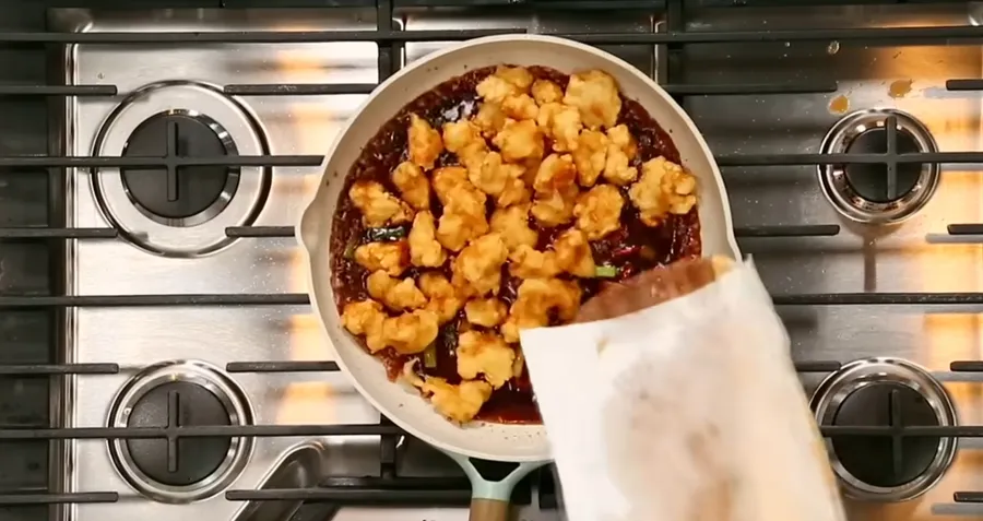Adăugăm bucățile de pui prăjit și amestecăm astfel încât sosul să acopere uniform fiecare bucată.
