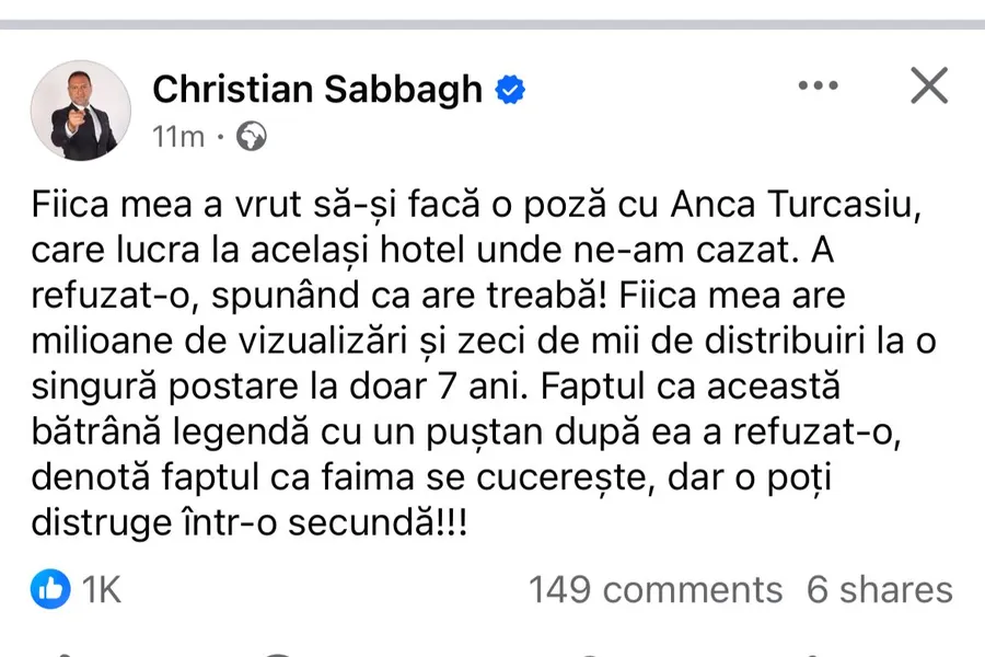 „Fiica mea a vrut să-și facă o poză cu Anca Țurcașiu, care lucra la același hotel unde ne-am cazat. A refuzat-o, spunând că are treabă! Fiica mea are milioane de vizualizări și zeci de mii de distribuiri la o singură postare la doar 7 ani. Faptul că această bătrână legendă cu un puștan după ea a refuzat-o denotă faptul că faima se cucerește, dar o poți distruge într-o secundă.”, a scris Christian Sabbagh pe contul său de Facebook.