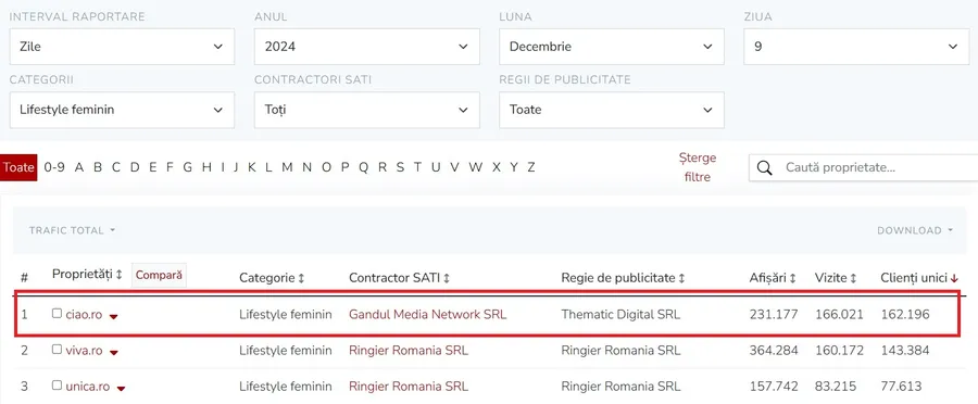 Potrivit cifrelor furnizate prin intermediul SATI (Studiul de Audiență și Trafic de Internet), CIAO.ro a fost accesat de 162.196 cititori unici la nivel global în ziua de luni, 9 decembrie 2024, fiind urmat de viva.ro cu 143.384 de cititori unici și unica.ro cu 76.613 de cititori unici.