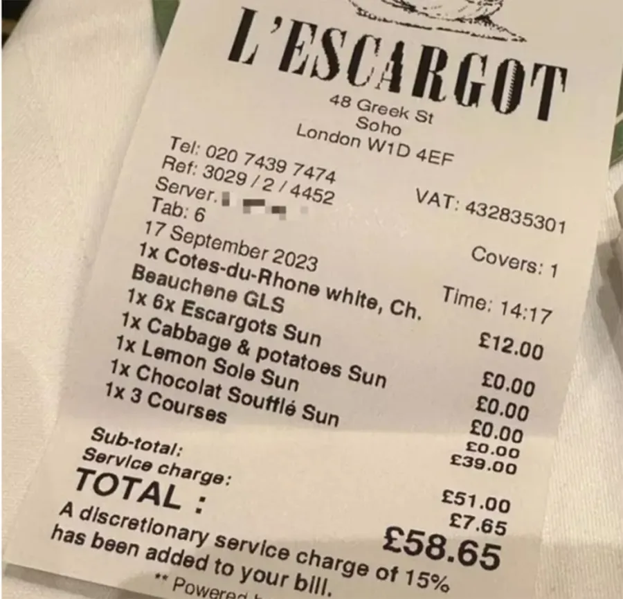 Pentru a se răsfăța, bărbatul a ales un local franțuzesc, unde a avut o consumație de 51 de lire. Se aștepta ca pe nota de plată să aibă acest total, maximul taxa de serviciu de 12,5% din costul mesei și să mai lase, eventual, un bacșiș, dar situația a fost cu totul alta.