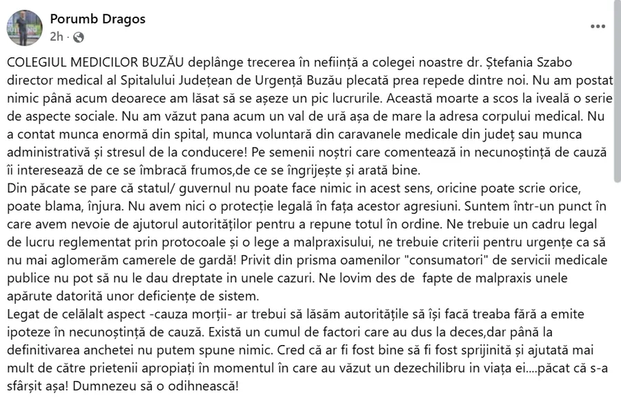 „Nu am postat nimic până acum, deoarece am lăsat să se așeze un pic lucrurile. Această moarte a scos la iveală o serie de aspecte sociale. Nu am văzut până acum un val de ură așa de mare la adresa corpului medical. Nu a contat munca enormă din spital, munca voluntară din caravanele medicale din județ sau munca administrativă și stresul de la conducere! Pe semenii noștri, care comentează în necunoștință de cauză, îi interesează de ce se îmbracă frumos, de ce se îngrijește și arată bine. Din păcate, statul/Guvernul nu poate face nimic în acest sens, oricine poate scrie orice, poate blama, înjura. Nu avem nicio protecție legală în fața acestor agresiuni. Suntem într-un punct în care avem nevoie de ajutorul autorităților pentru a repune totul în ordine. Ne trebuie un cadru legal de lucru reglementat prin protocoale și o lege a malpraxisului, ne trebuie criterii pentru urgențe, ca să nu mai aglomerăm camerele de gardă!”, a scris reprezentatul Colegiul Medicilor din Buzău.