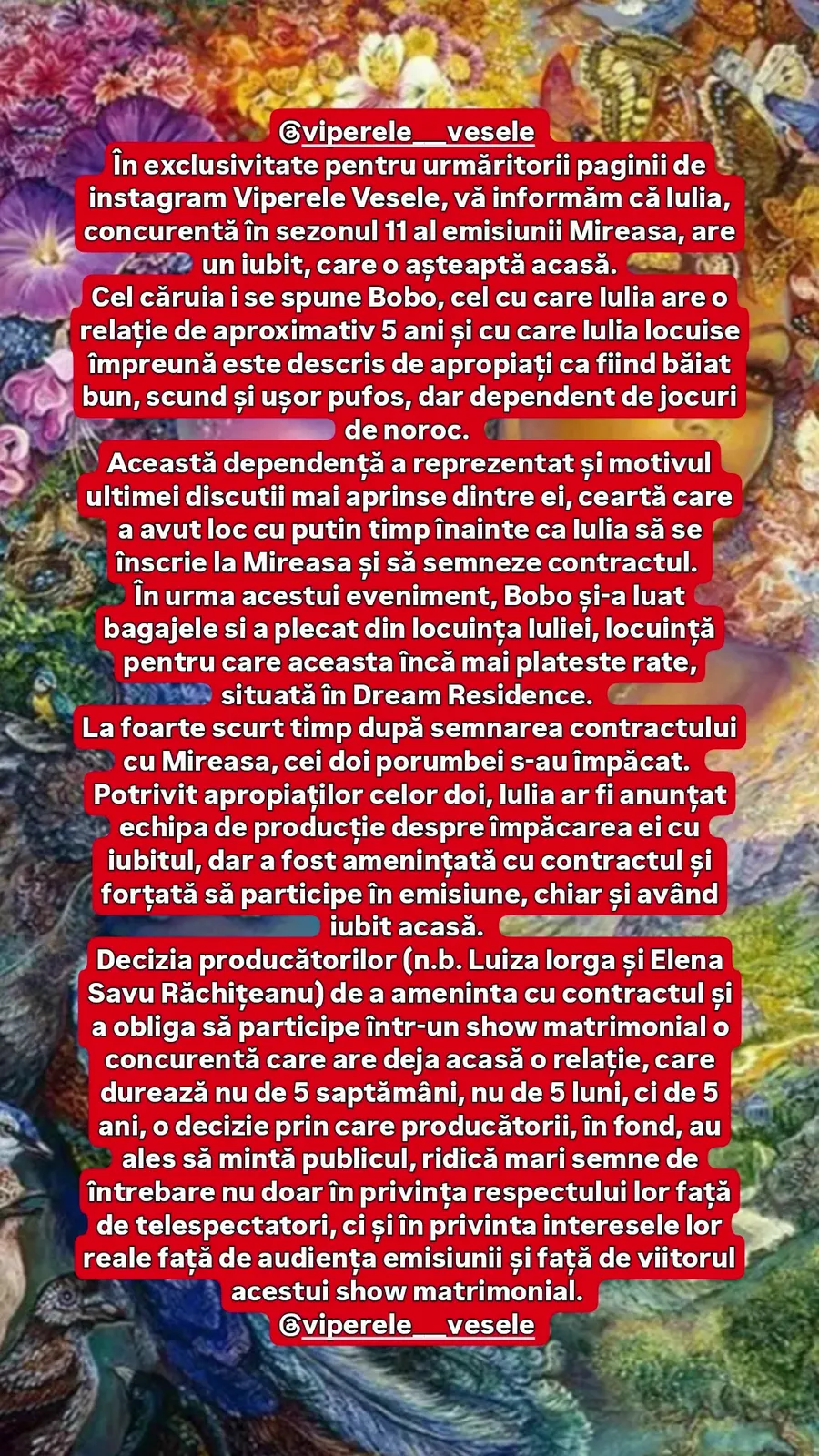 „În exclusivitate pentru urmăritorii paginii de instagram Viperele Vesele, vă informăm că lulia, concurentă în sezonul 11 al emisiunii Mireasa, are un iubit, care o așteaptă acasă.