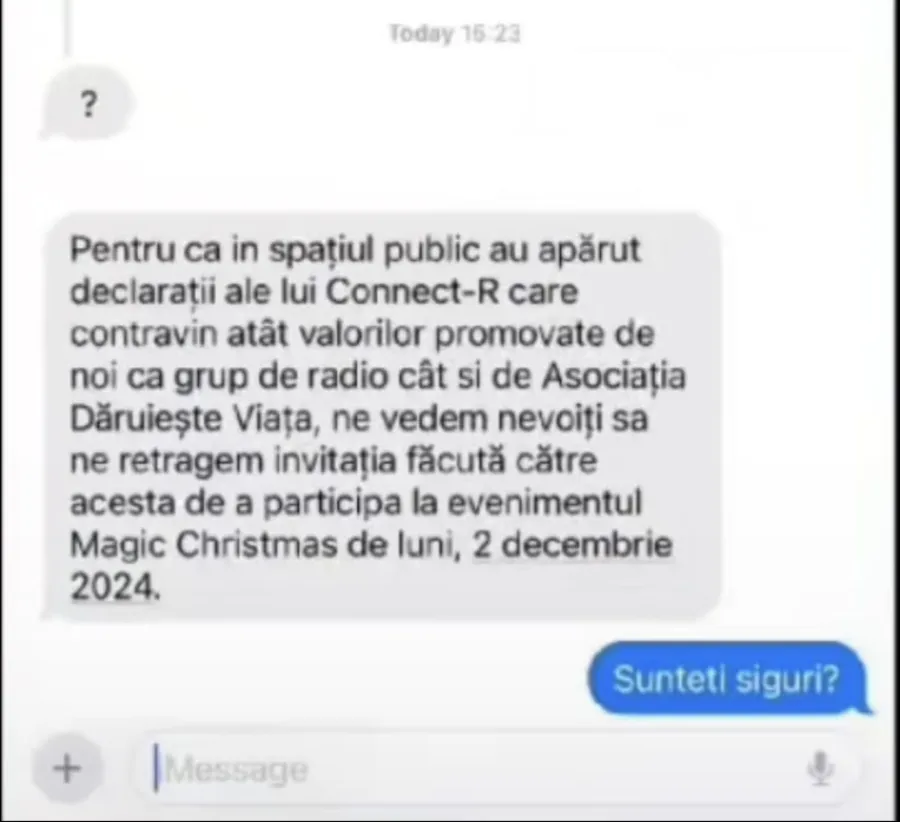 „Pentru că în spaţiul public au apărut declaraţii ale lui Connect-R care contravin atât valorilor promovate de noi ca grup de radio, cât şi de Asociaţia Dăruieşte Viaţă. Ne vedem nevoiţi să ne retragem invitaţia făcută acesta de a participa la evenimentul Magic Christmas de luni, 2 decembrie 2024.”, este mesajul pe care primit de Connect-R de la Kiss FM.