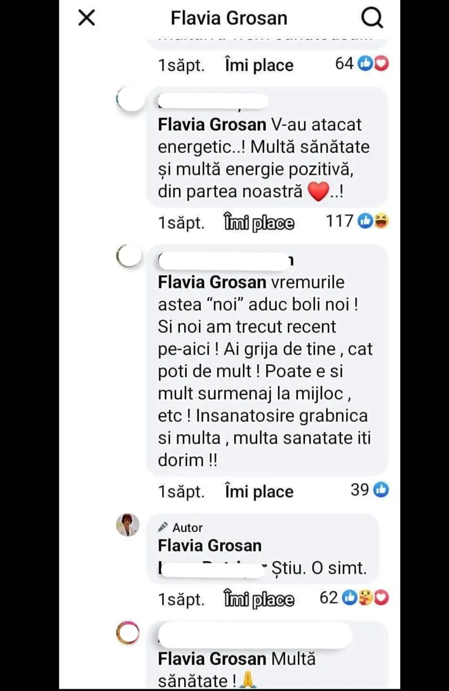 În urmă cu aproximativ o lună, înainte să fie internată la ATI, Flavia Groșan le-a spus prietenilor virtuali, referitor la starea sa de sănătate, că: ”Vremurile astea ”noi” aduc boli noi! Și noi am trecut recent pe-aici! Ai grijă de tine, cât poți de mult! Poate e și mult surmenaj la mijloc etc! Însănătoșire grabnică și multă, multă sănătate îți dorim”.