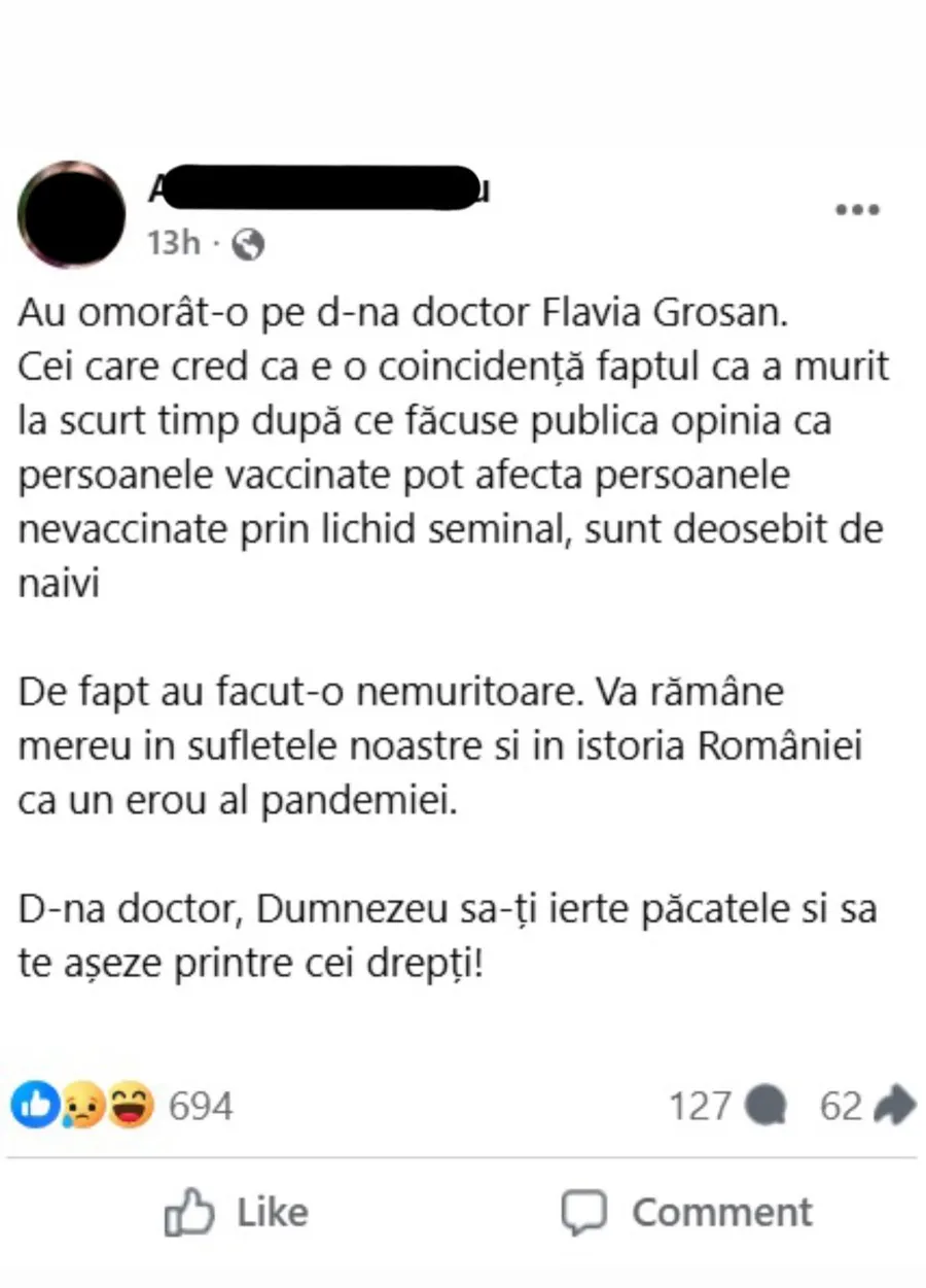 ”Au omorât-o pe d-na doctor Flavia Groșan. Cei care cred că e o coincidență faptul că a murit la scurt timp după ce făcuse publică opinia sa despre persoanele vaccinate, sunt deosebit de naivi. De fapt, au făcut-o nemuritoare.