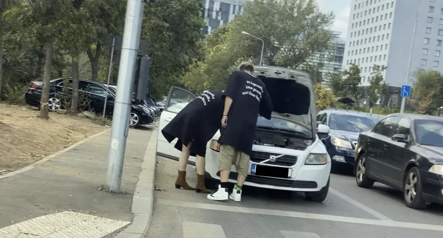 Îmbrăcați pe stilul ”matchy-matchy”, cu tricouri negre oversized, Cristina Cioran și iubitul ei s-au uitat preț de câteva minute bune sub capotă, dar n-au observat nimic „dubios” astfel că au închis capota, s-au întors în mașină și și-au văzut liniștiți de drum.