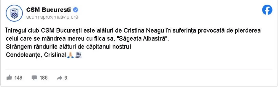 „Întregul club CSM Bucureşti este alături de Cristina Neagu în suferinţa provocată de pierderea celui care se mândrea mereu cu fiica sa, ‘Săgeata Albastră’. Strângem rândurile alături de căpitanul nostru! Condoleanţe, Cristina!”, a transmis CSM Bucureşti.