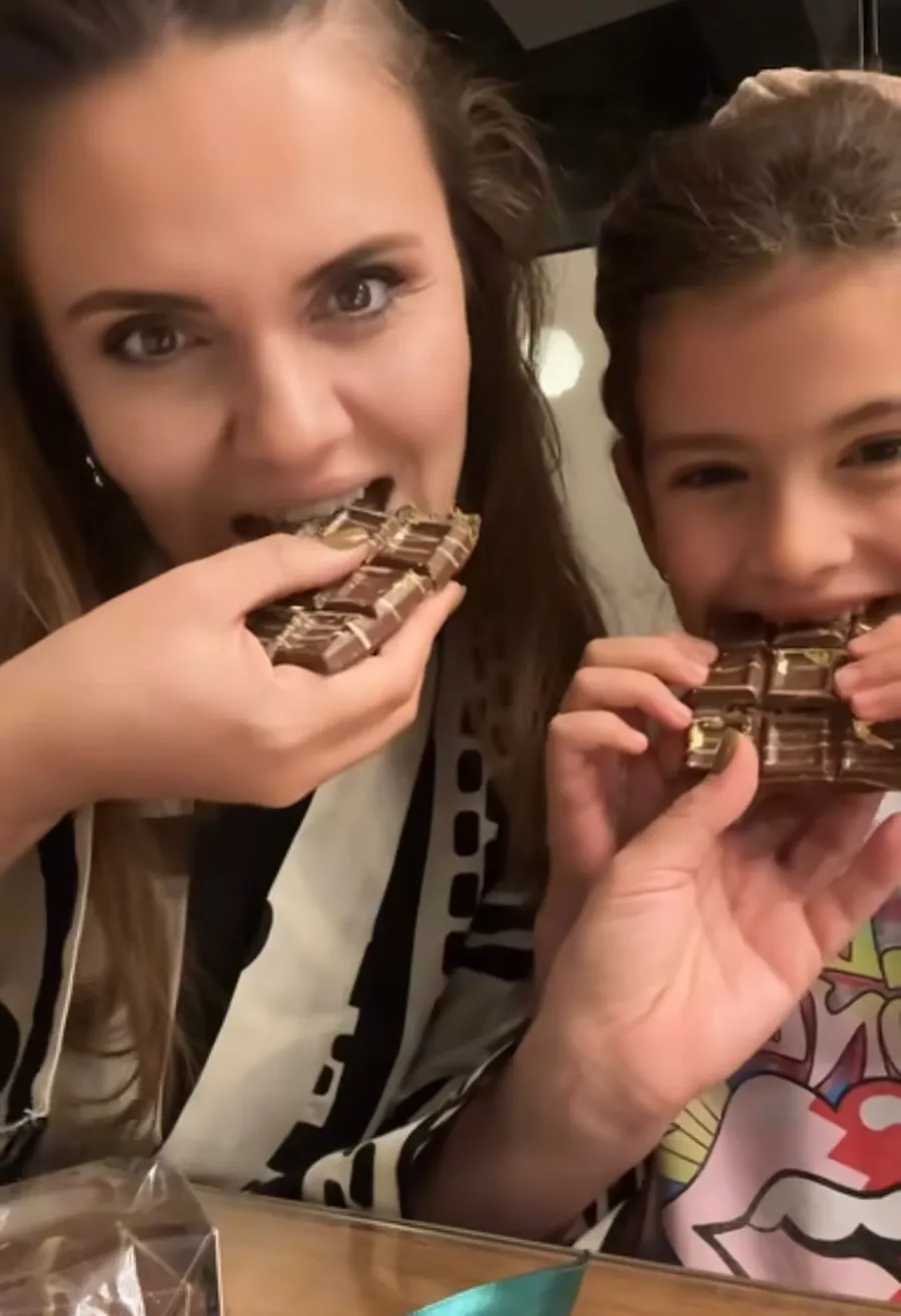 ”Cristina Șișcanu: Ce ne facem, ce ne facem. Am primit ciocolata Dubai. Tati a adus-o acasă. Ia să vedem. Petra, tu deja ai mâncat multă. Ce mă fac, ce mă fac?!
