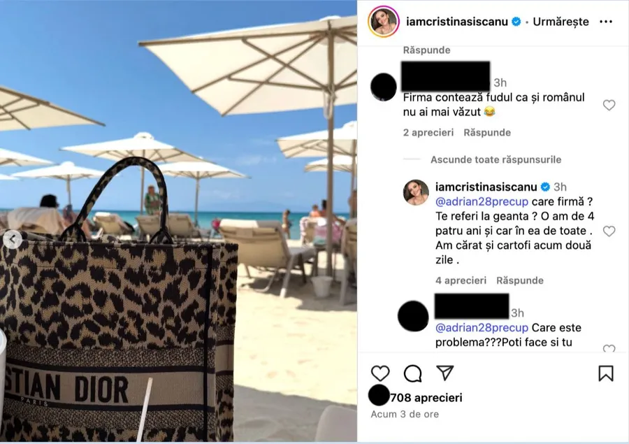Vrând să facă o fotografie artistică, Cristina Șișcanu a pozat plaja, șezlongurile și marea, însă, în cadru a lăsat să se vadă și geanta sa Dior. Așa cum cel mai probabil era de așteptat, utilizatorii au reacționat. Unul dintre ei a luat-o peste picior, dând de înțeles faptul că fotografia a fost făcută special pentru a se lăuda cu brandul genții saele. În apărarea sa, mai în glumă, mai în serios, soția lui Mădălin Ionescu i-a dat replica.