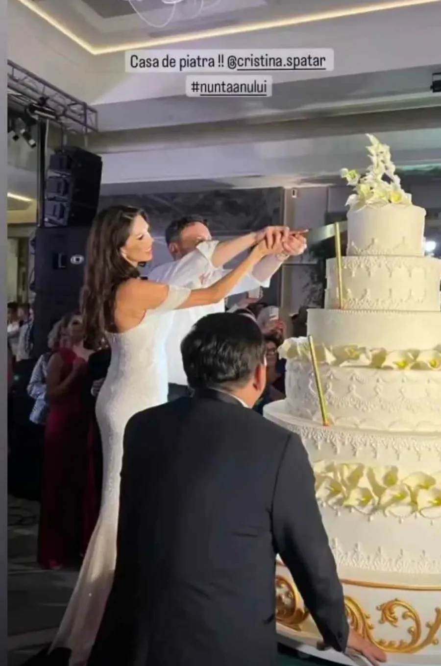 Luxul și opulența i-au caracterizat nunta Cristinei Spătar! La 12 noaptea, momentul în care se taie tortul mirilor, cei mai bine de 500 de invitați au avut parte de o surpriză de proporții! Nu mai puțin de 7 etaje a avut tortul alb de 150 de kilograme, iar fiecare a fost decorat diferit, cu elemente care imită decorațiunile de aur. Cu greu au reușit mirii să taie o asemenea prăjitură imensă.