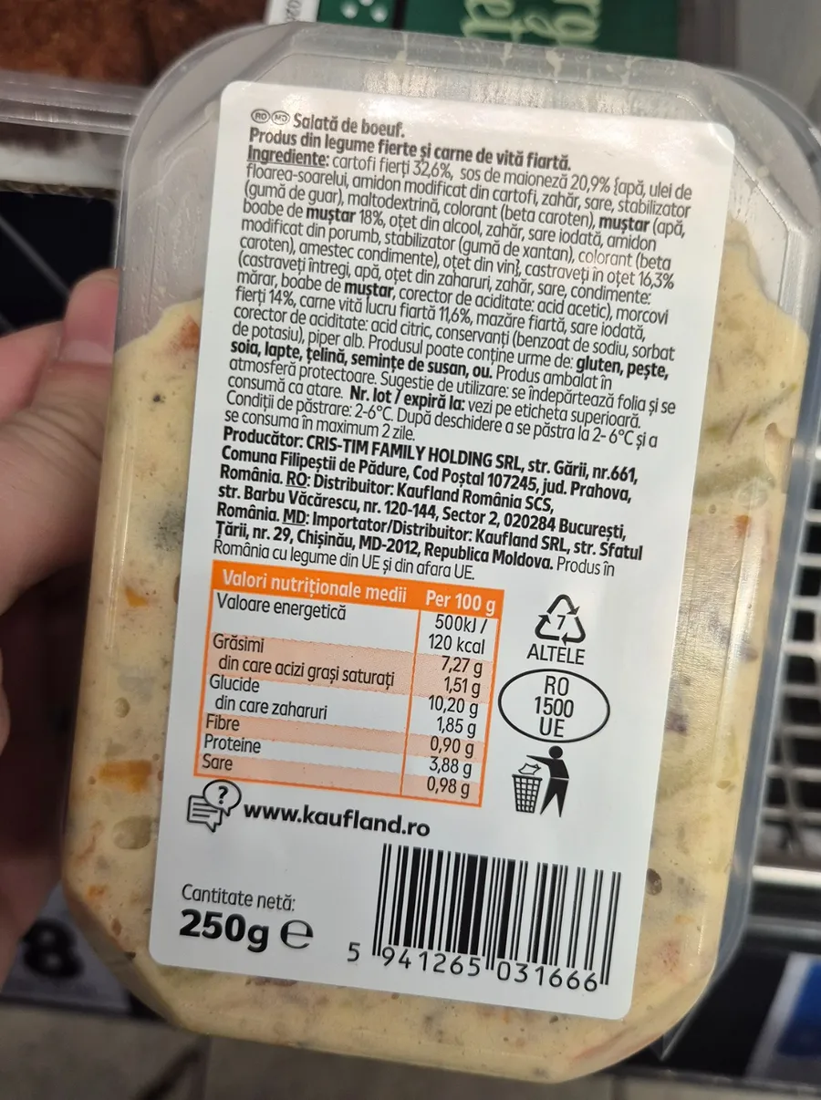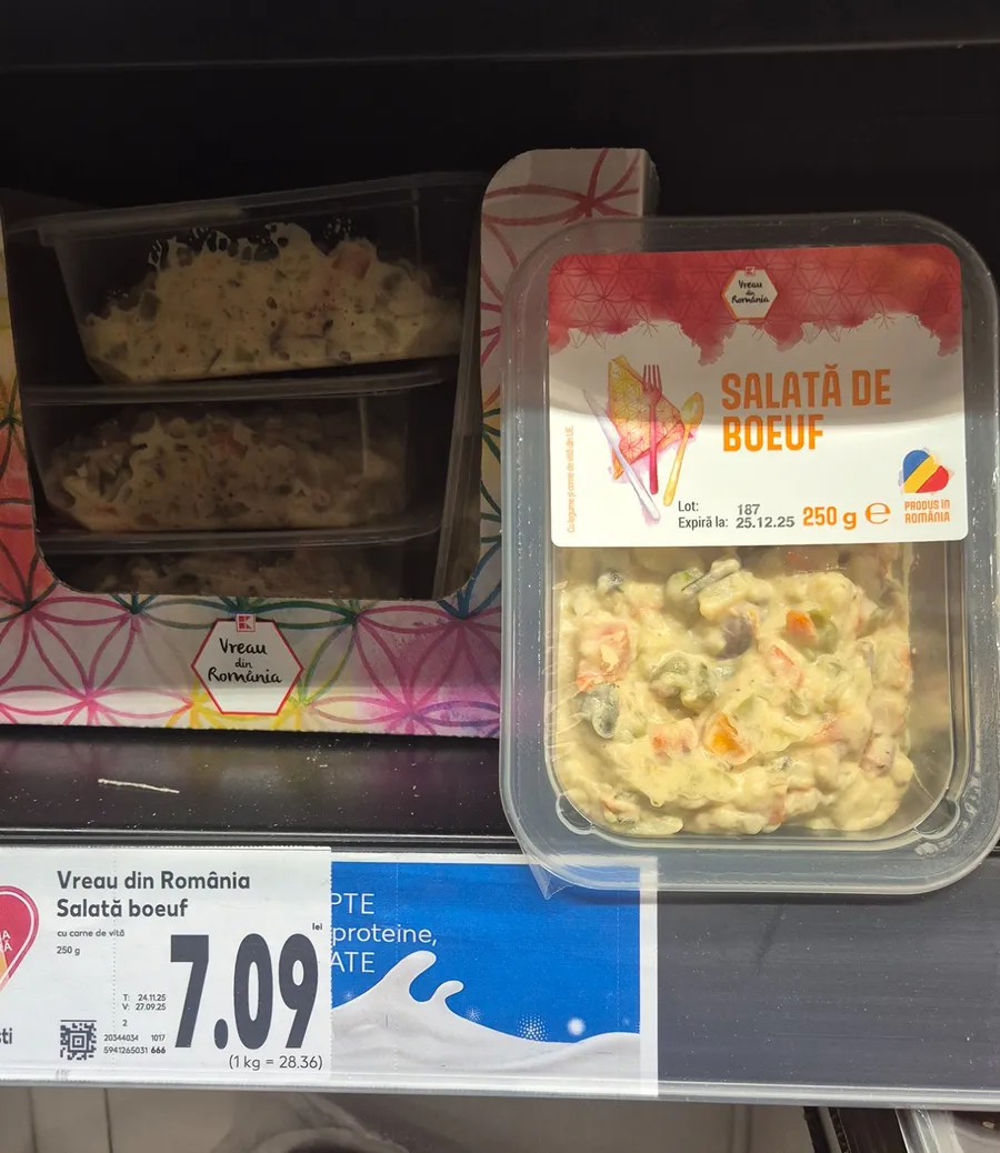 În prezent, un pachet de salată de boeuf cu carne de vită de 250 de grame, disponibil în raioanele de produse gata preparate din Kaufland, se vinde cu 7,09 lei. Calculat pe kilogram, acest preț ajunge la aproape 28,36 lei, ceea ce poate părea semnificativ, mai ales în comparație cu produsele similare preparate acasă sau cele oferite de producători locali.