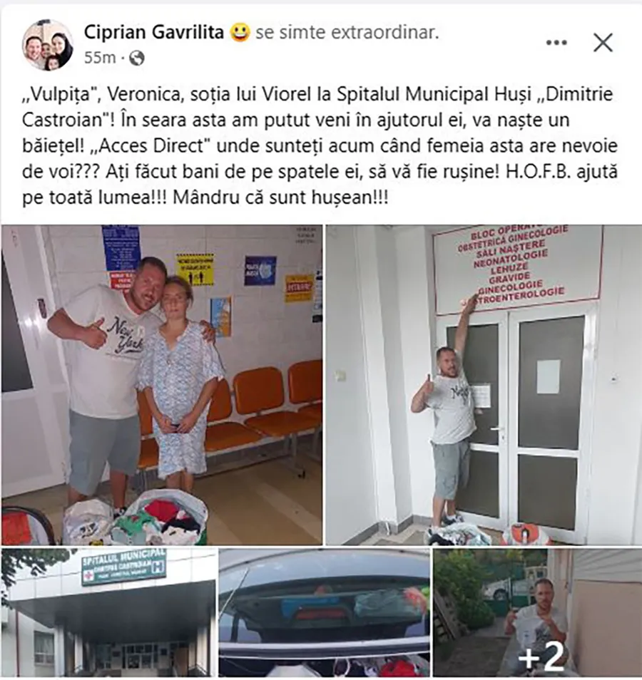 „Veronica Vulpița, soția lui Viorel, la Spitalul municipal „Dimitrei Castroian” Huși. În seara asta am putut veni în ajutorul ei, va naște un băiețel. „Acces Direct” unde sunteți acum, când femeia are nevoie de voi? Ați făcut bani pe spatele ei, să vă fie rușine! H.O.F.B. ajută pe toată lumea! Mândru că sunt hușean”, este mesajul scris de Ciprian Gavriliță, pe Facebook.