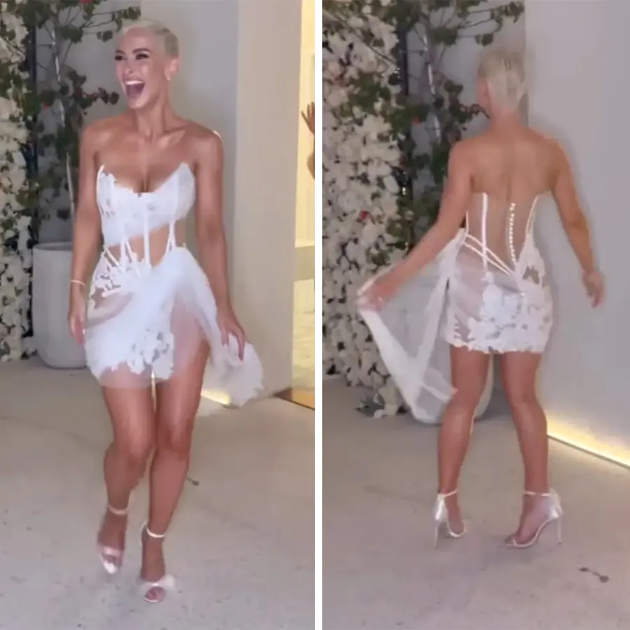 Inițial, Ellie s-a afișat cu o rochie de mireasă albă, cu un model care a fost extrem de apreciat de invitați. Rochia, cu decupaje florale, i-a pus în valoare silueta și a avut un decolteu generos. Însă, mai spre seară, tânăra de 33 de ani și-a schimbat rochia, pentru a avea mobilitate pe ringul de dans. A fost o surpriză reală atât pentru soțul ei, Ross Scutts, cât și pentru invitați.