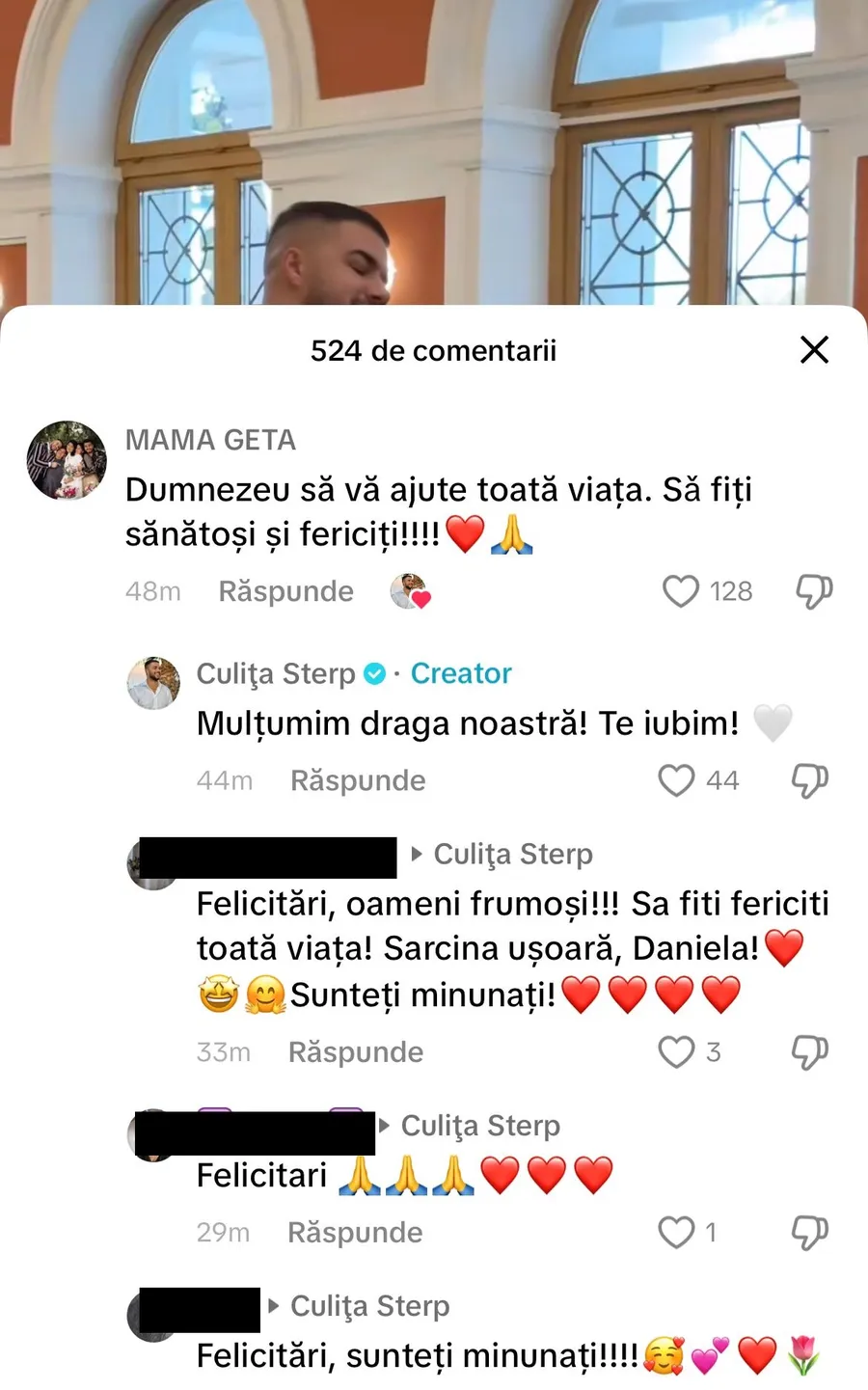 „Dumnezeu să vă ajute toată viața. Să fiți sănătoși și fericiți”, i-a scris mama Geta lui Culiță, într-un comentariu pe TikTok.