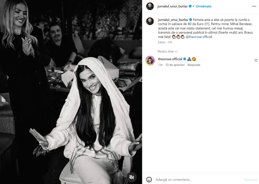 „Femeia asta a ales să poarte la nuntă o rochie în valoare de 80 de Euro (!!!). Pentru mine, Mihai Bendeac, acesta este cel mai mișto statement, cel mai frumos mesaj transmis de o persoană publică în ultimii (foarte mulți) ani. Bravo, măi fată!”, a scris Mihai Bendeac dreptul unei fotografii cu Theo Rose din ziua nunții.