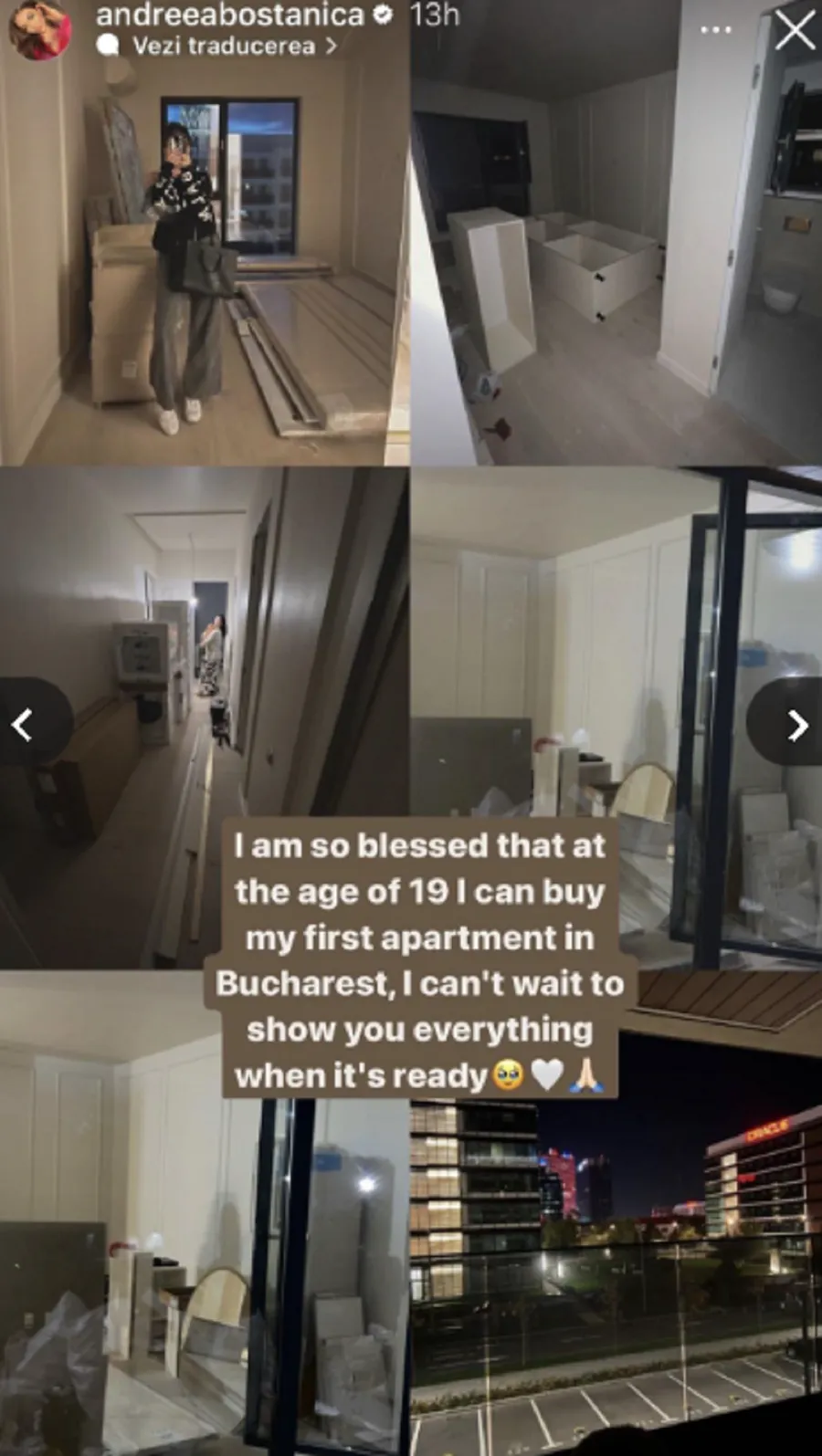 ”Sunt binecuvântată că la vârsta de 19 ani am putut să-mi cumpăr primul apartament în București. Abia aștept vă arăt când o să fie totul gata”, a scris influencerița pe Instagram.