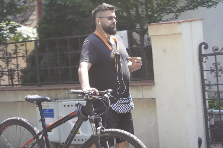 Edi Stancu, moment de respiro, cu o cafea în mână, pe lângă bicicletă (Foto: CANCAN.RO)