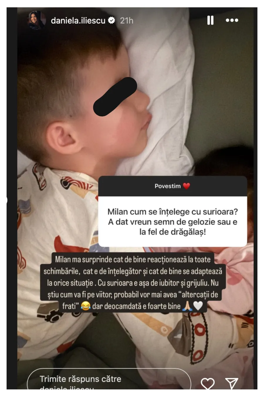 „Milan mă surprinde cât de bine reacționează la toate schimbările, cât e de înțelegător și cât de bine se adaptează la orice situație. Cu surioara e așa iubitor și grijuliu. Nu știu cum va fi pe viitor, probabil vor mai avea „altercații de frați”, dar deocamdată e foarte bine. ”, a transmis Daniela pe Instagram.