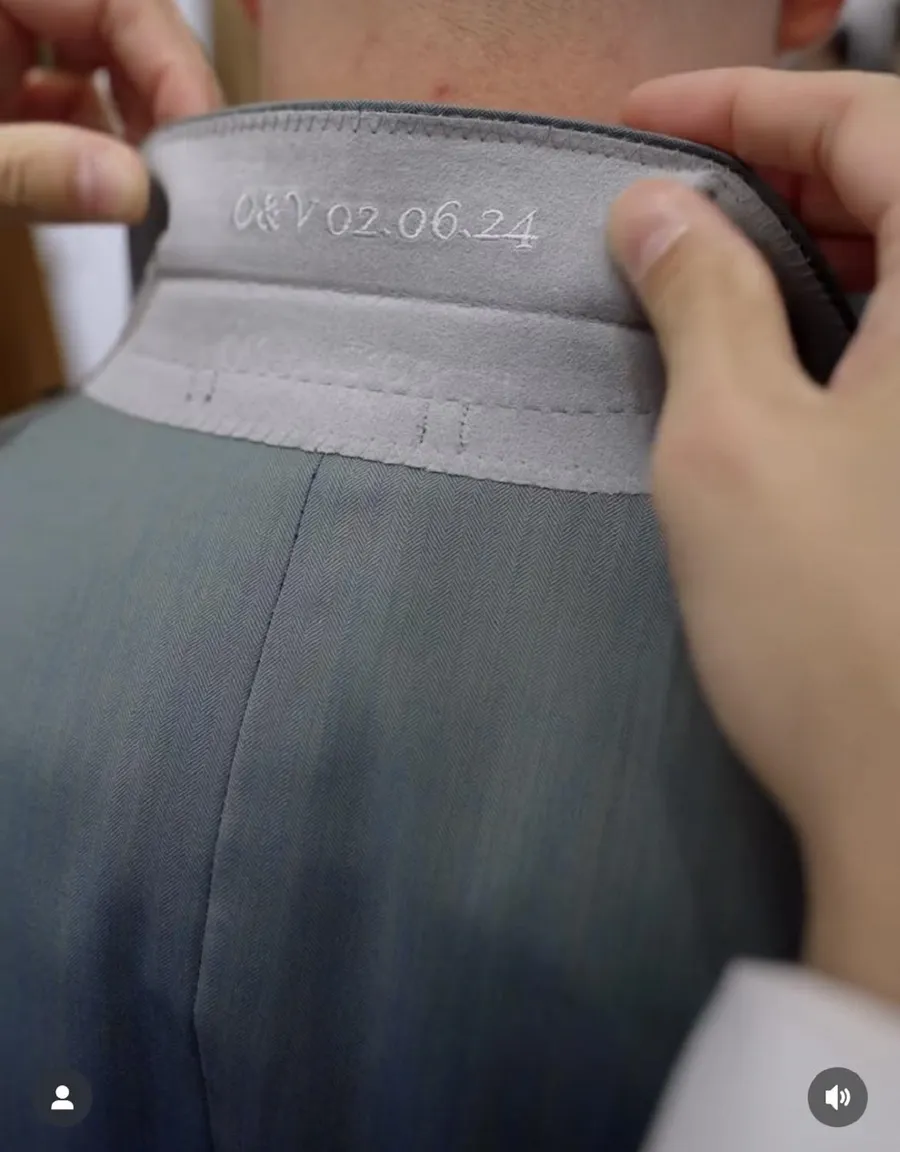 Totodată, inițialele mirelui sunt brodate și pe manșeta mânecii de la cămașă. Primul costum – cel de la biserică – este complet negru, cu o vestă neagră, un paion elegant, cămașă albă și o pereche de pantofi negri, iar costumul pentru petrecere este gri, tot cu o cămașă albă, asortat cu o pereche de mocasini din piele neagră – vezi GALERIA FOTO.