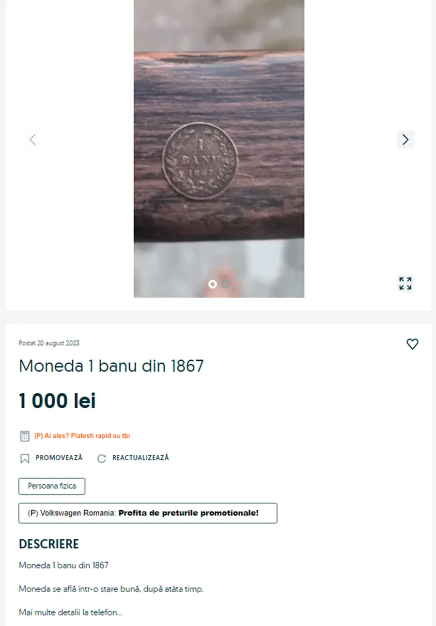 Dacă ai pe acasă sau o găsești pe la bunici, ai dat lovitura. Moneda de 1 ban din 1867 se vinde cu 1.000 de lei acum, în 2023. Pe cel mai cunoscut site de mică publicitate din România sunt publicate zilnic zeci de anunțuri din partea posesorilor de monede vechi.