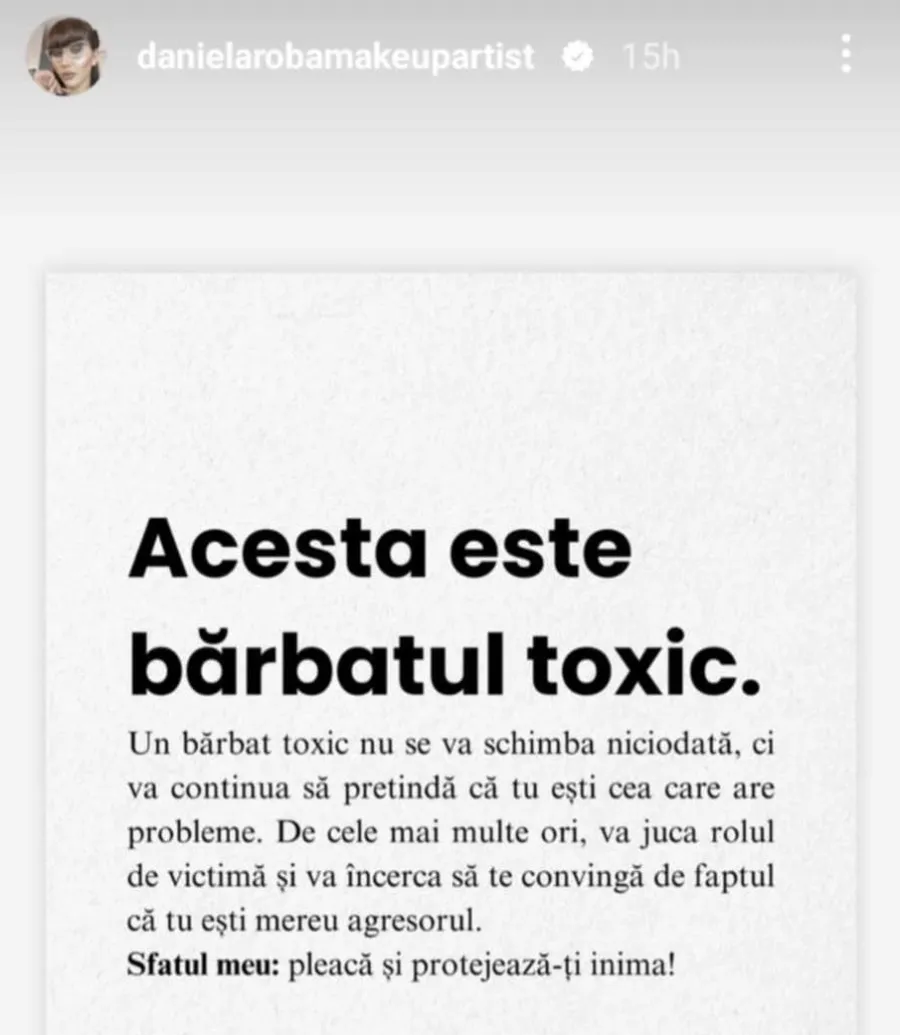 ”Un bărbat toxic nu se va schimba niciodată, ci va continua să pretindă că tu ești cea care are probleme. De cele mai multe ori, va juca rolul de victimă și va încerca să te convingă de faptul că tu ești mereu agresorul. Sfatul meu: pleacă și protejează-ți inima!”, a transmis Dana Roba, în mediul online.