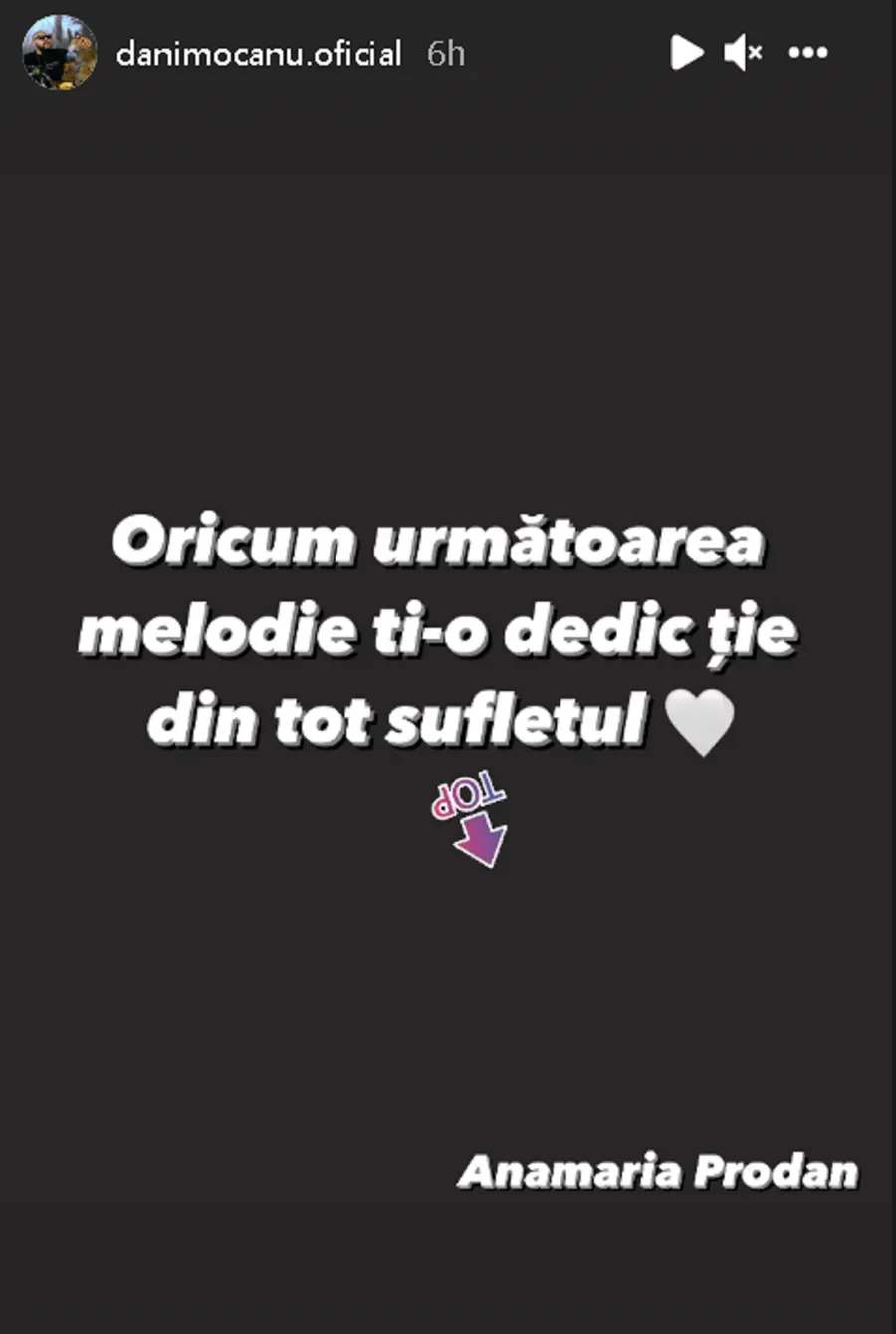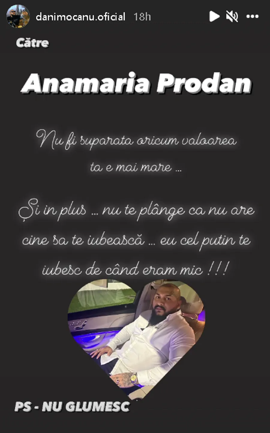 ”Către Anamaria Prodan: Nu fi supărată, oricum valoarea ta e mare. Și, în plus, nu te plânge că nu are cine să te iubească. Eu, cel puțin, te iubesc de când eram mic. P.S.: Nu glumesc”, a scris Dani Mocanu pe instastory, la câteva ore după ce Laurențiu Reghecampf a afirmat că divorțează.