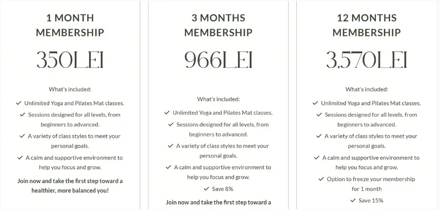 Pe site-ul oficial al studioului de pilates și yoga este precizat că antrenamentele sunt unele de lux. Așadar, prețurile sunt și ele pe măsură. Spre exemplu, pentru un abonament de o lună, clienții trebuie să scoată din buzunar suma de 350 de lei, iar pentru trei luni, 966 de lei. Cei care aleg să plătească pe un an, costurile sunt de 3.570 de lei.