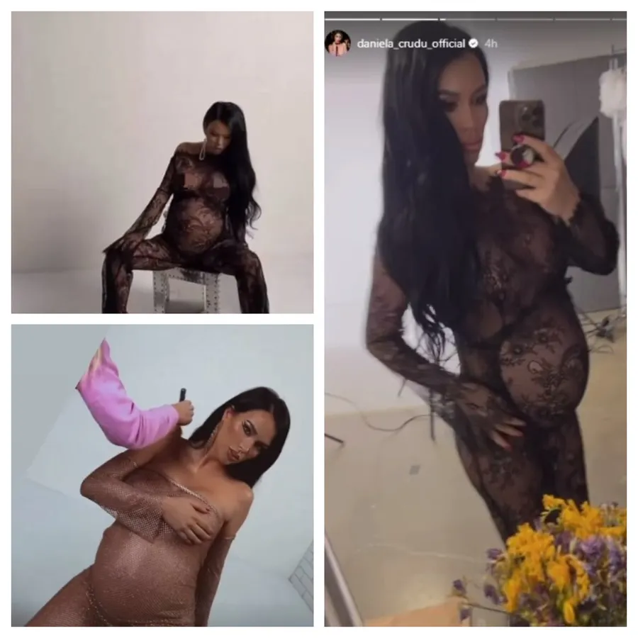În imaginile postate, Daniela Crudu apare îmbrăcată în două salopete din dantelă, fără lenjerie intimă. Cu un machiaj impecabil și o coafură lejeră, „Cruduța” a pozat fără inhibiții, în cadrul celei mai recente ședințe foto, înainte de a naște.