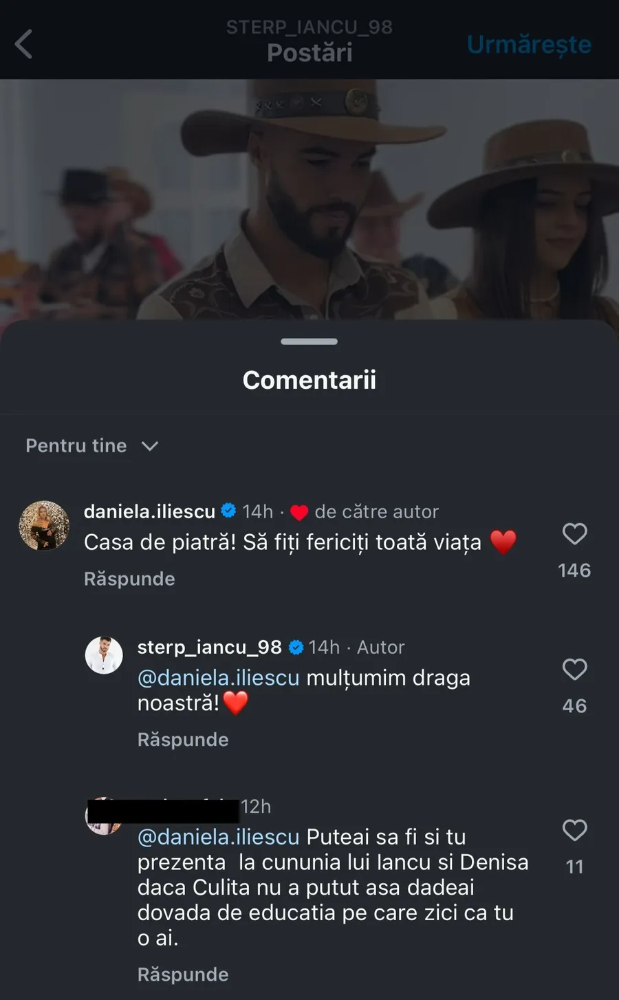 Comentariul Danielei Iliescu de la postarea lui Iancu Sterp / Foto: Instagram