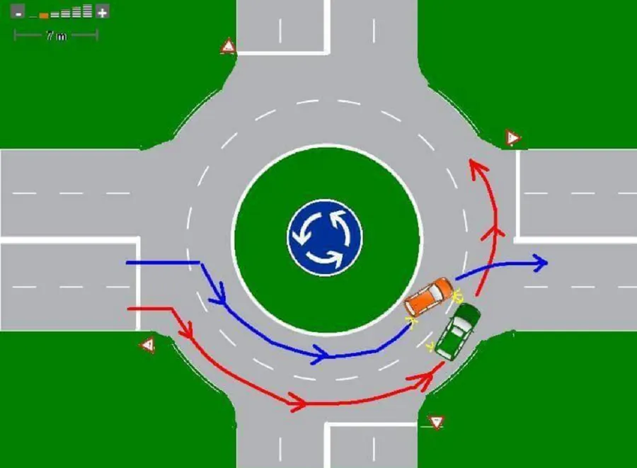 Direcția de deplasare într-un sens giratoriu este un cerc, deci de fiecare dată când ieşi din giratoriu, părăseşti cercul, adică schimbi direcția de mers şi trebuie să te asiguri. În cazul unei tamponări, dacă nu se va încheia un formular de constatare amiabilă, conducătorul autoturismului portocaliu va fi sancționat conform articolului 54 alin. 1 din OUG 195/02R, cu amendă de la 4 la 5 puncte amendă şi cu 3 puncte de penalizare.